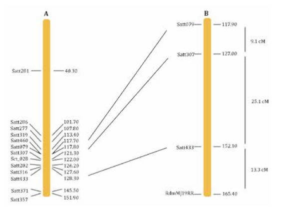 In order to detect the SSR that were close to the resistance gene, we considered PCR sensitivity as reported for bulk segregant analysis (13). The markers Satt382 from Chr 5, Satt433 from Chr 6, Satt182 from Chr 19, and Satt152 from Chr 3 were selected as candidates considering low intensity amplification the resistant allele in susceptible bulk (SB) as a sign of low recombination between the markers and the resistance gene.