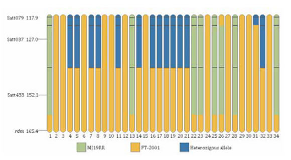 Figure 2. Recombination in distal region of chromosome 6 in 34 susceptible plants of mapping population. Orange fragments denote susceptible allele of FT-2001, green fragments denote the resistant allele of MJ19RR blue fragments, denote heterozygous regions.