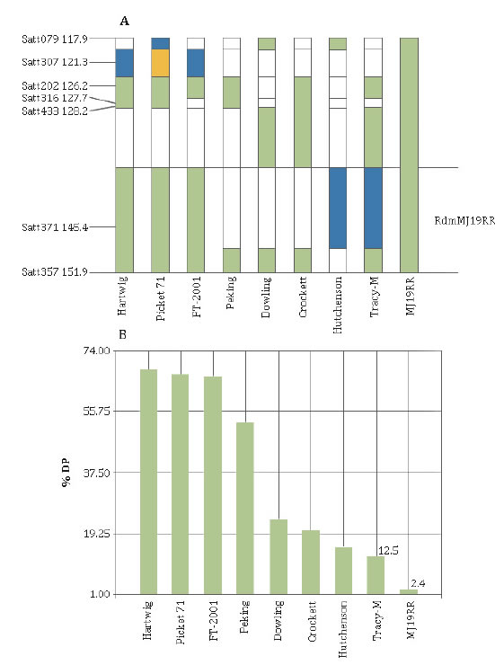 Figure 3. A: allelic combination of the distal end of chromosome 6 in all known Dpm resistance sources. Green fragments denote presence of alleles resistant of MJ19RR. B: percentage of dead plant index (% DP) with response to Dpm (RS12) inoculation.