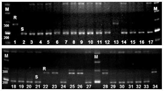 Foto 2. Amplificación de Satt433 en las 34 plantas susceptibles de la población de mapeo. R, alelo resistente de MJ19RR; S, alelo susceptible de FT-2001. M, marcador de peso molecular.