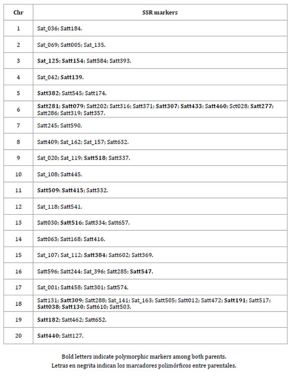 Tabla 1. Cromosomas (Chr) y marcadores SSRs usados en la caracterización de los parentales MJ19RR y FT-2001.