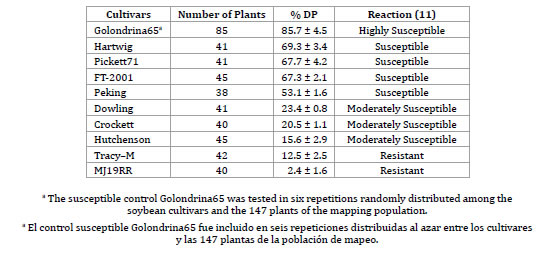 Tabla 2. Porcentaje del índice de plantas muertas (% DP) de genotipos de soja inoculados con el aislado RS12 de Diaporthe phaseolorum var. meridionalis.