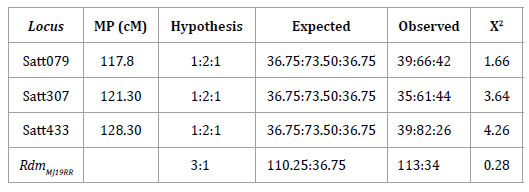 Table 3. Chi-square for the resistance locus RdmMJ19RR and the SSR markers in F2 generation of MJ19RR x FT-2001 and its positions (MP) in the soybean molecular map (19).