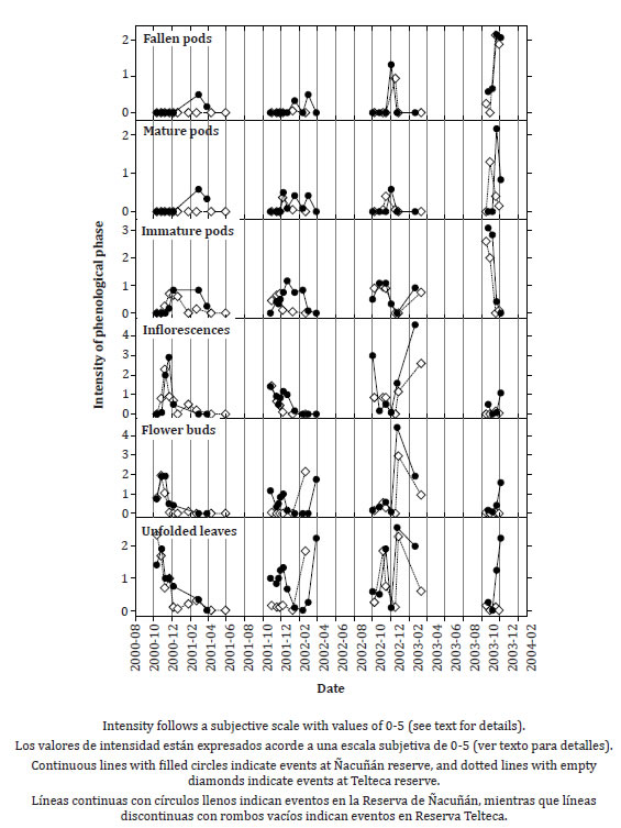 Percentages of trees were calculated, showing different reproductive phenological phases along the growing season: flower buds, inflorescences, juvenile pods, mature pods, and vegetative growth. In this last phase, we only considered non-expanded leaves. Presence of those plant components was enough to consider that a tree was going through a phenological phase, without considering its intensity. For this variable, we used all the available data, seven years for each site that overlapped during 2000-2004 reproductive periods.