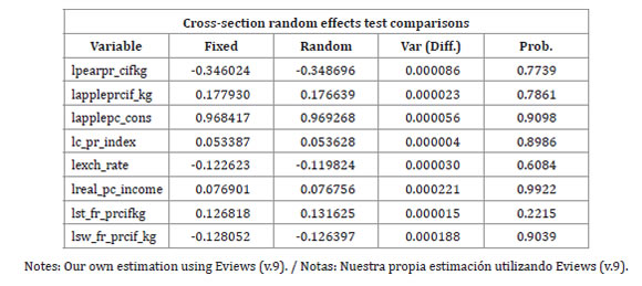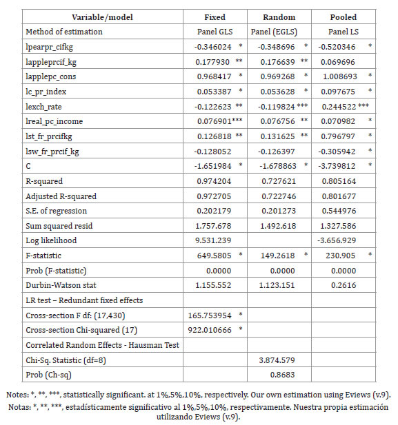 The explanatory power of the estimated models, were highly and statistically significant. The Hausman test showed that, among the three cited models (table 1), the random effects model (EGLS Panel), was the best for studying this complicated international food market.