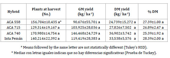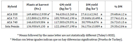 No significant differences (p≤0.05) in yields among genotypes were detected in both crop cycles. In the 2015-2016 crop cycle average GM and DM yields were 110,024 kg/ha-1 and 30,914 kg/ha-1, respectively, whereas during the 2016-2017 crop cycle average GM and DM yields were 115,122 kg/ha-1 and 30,752 kg/ha-1, respectively.