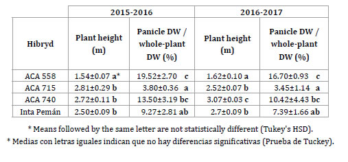 Table 4. Plant height, and panicle DW/ whole-plant DW ratio of the sorghum hybrids included in the trial. 2015-2016 and 2016-2017 crop cycles, Luján de Cuyo, Mendoza, Argentina.