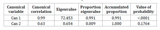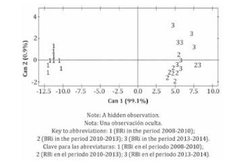 The value obtained by running the CDA test with this statistic (0.008 with P < 0.0001), indicates that the multivariate contrast that explains the relationship between the values of the nine reserves' eight indicators in the three periods analyzed, is significant (α = 0.05). This statistic also revealed that there is separation between groups and a supposition of multivariate error normality.