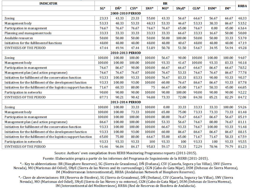 The study of the performance of values obtained from the Monitoring Programme indicators of the RERB has enabled different phases in the implementation of Andalusian BRs to be established. The statistical methods used have enabled identification of those aspects of the management of Andalusian BRs that need to be strengthened in order to increase their levels of implementation. Nevertheless, there are still many aspects that need to be studied in terms of each of the factors that shape the way the BRs of Andalusia are implemented.