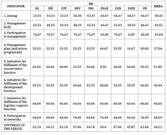 In general terms, when a protected area, and particularly a BR, is effectively managed and administered, it becomes a secure site for the conservation of biodiversity and for the provision of ecosystems services that in turn contribute to humanity welfare (7, 10, 13, 15, 17, 44). There is thus a need, as other authors have acknowledged, to identify performance indicators for BRs enabling the effectiveness of attainment of its goals to be evaluated, and hence its contribution to global targets for conservation and sustainability (19).