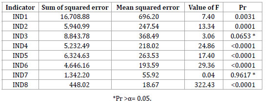 The ANOVA of the indicators, to a 0.05 degree of significance, highlighted significant differences in indicators 1, 2, 4, 5, 6 and 8, but not in indicators 3 or 7 (table 5).