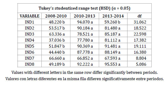 It is noticeable that seven of the eight indicators show no significant differences for the periods 2010-2013 and 2013-2014. The 2008-2010 period is significantly different from the other two periods for five of the eight indicators. The three periods analysed do not show significant differences for indicators 3 and 7. The 2010-2013 period exhibits significant differences with respect to the other two for indicator 1.