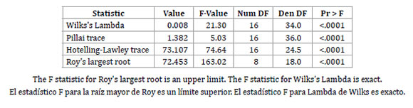 Tabla 7. Estadísticos de múltiples variables y aproximaciones F.