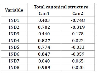 Table 9, shows the coefficients of total canonical structure (also known as the correlation structure or canonical discriminant weights), which indicate the correlations between the indicators and the canonical functions.