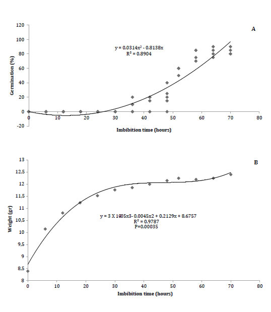 During the initial hours (0-20 hours), a rapid increase in weight was observed, corresponding to the first phase of imbibition, characterised by a rapid increase in water absorption. Afterwards, increases in weight were stable, followed by another increase in weight corresponding to the appearance of the radicle.