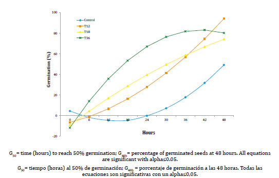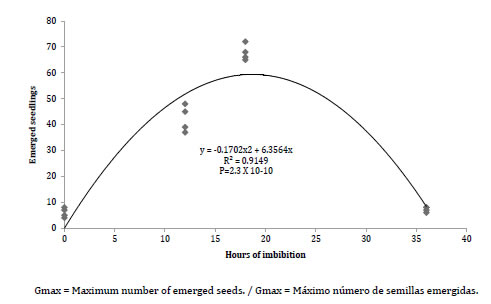 Temperature and RH were kept constant (27±3 °C and 90% HR). Once the imbibition time was finalised, the seeds were removed from the humidity chamber and replaced on absorbent paper at room temperature until they returned to their original weight prior to imbibition (approximately 120 hours). Afterwards, the seeds were placed in humidity chambers to determine the number of germinated seeds over time; measurement were recorded every six hours. The recorded data were subjected to a regression analysis in Microsoft Excel®.