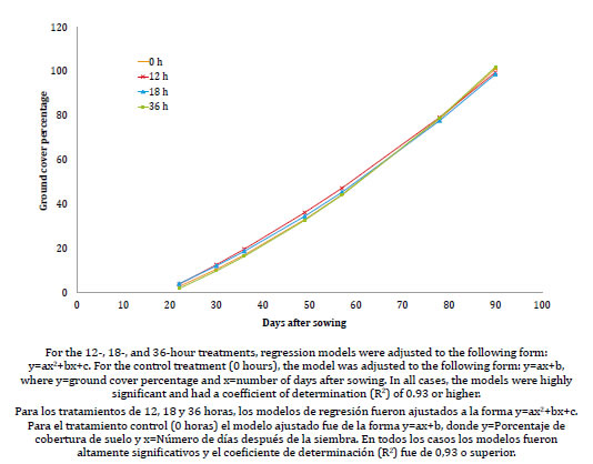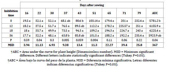 Plant height demonstrated significant differences at 37 and up to 43 DAS. During this period, seeds hydroconditioned for 36 hours showed an average height equal to the control treatment, while the 12- and 18-hour treatments had a greater height. For the rest of the sampled dates, plants did not show significant differences. Overall, and in terms of accumulated growth, seeds imbibed for 12 or 18 hours resulted in plants of greater height in comparison with the control treatment (table 1).