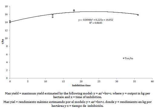 The imbibition treatments showed an effect on yield. The generated data were used as inputs for a mathematical model to estimate maximum yield, resulting in 16.6 tper hectare and corresponding with 22.12 hours of imbibition. Upon surpassing this time frame, plant yield decreased to 15.6 tper hectare (figure 5, page 82).
