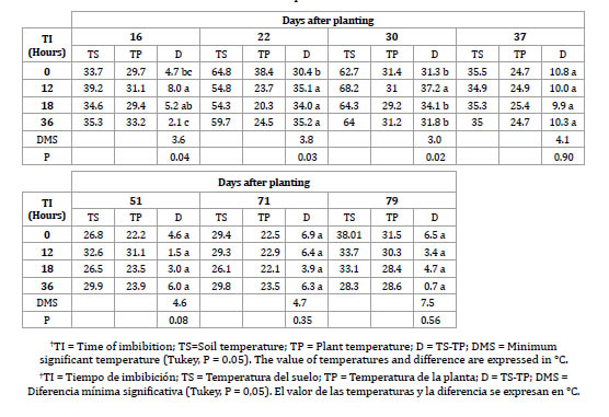 For the 0-, 12-, and 18-hour treatments, plant and soil temperatures significantly differed differed significantly at16, 22, and 30 DAS. A lower difference in temperature after 16 days, was found with the 36-hour treatment, while the 12-hour treatment presented the greatest temperature difference. At 22 DAS, an increase in solar energy resulted in a higher soil temperature; causing that plants from imbibed seeds of all treatments showed a difference in relation to non-treated seed. At 30 DAS, only the 12-hour treatment demonstrated a statistically significant difference in comparison with the other treatments. For the rest of the sampling dates, no significant differences were found (table 2, page 80).