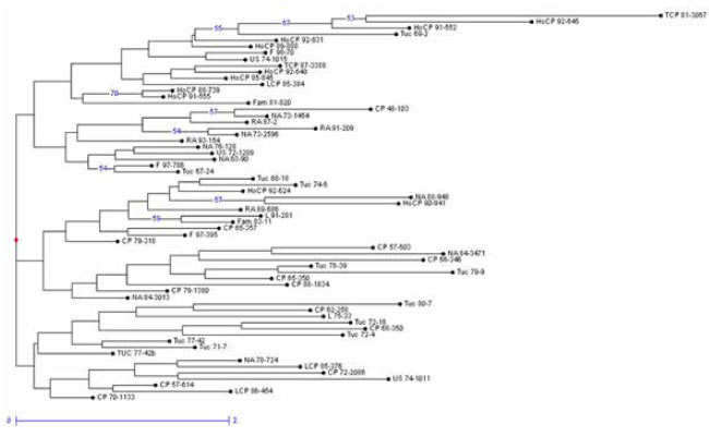 The highest distance value was estimated between the genotypes TUC79-9 and TCP81-3067 (10.79). In opposition, HoCP88-739 and HoCP91-555 were very close to each other showing the lowest Euclidean distance value (0.48). Non-Euclidean distance between pairs of accessions was zero meaning that quantitative traits included in this study were sufficiently discriminative to differentiate unequivocally among all the accessions. The dendrogram generated with UPGMA cluster analysis of de Euclidean distance matrix, revealed nine clusters with more than 50% bootstrap values (figure 1).