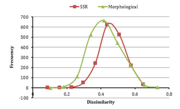 The distribution of values for morphological and genetic dissimilarity (calculated with qualitative traits and SSRs data) did not differ substantially. The distribution based on morphological data was slightly biased toward small values of distance (figure 6).