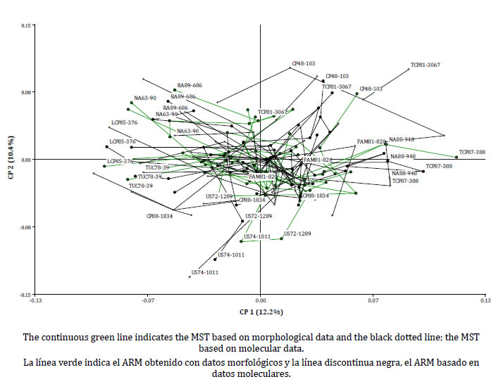 A principal Component Analysis (PCA), using the canonical Euclidean distance from quantitative morphological data, was carried out. The ordination was visualized simultaneously by means of biplots where sugarcane genotypes and variables were represented in a common space. For qualitative morphological and molecular data, genetic similarities matrices were used to perform Principal Coordinate Analysis (PCoA). According to Cliff (Franco and Hidalgo, 2003), only those coordinates whose accumulated values accounted for 70% or more of the total variance were considered. To facilitate the understanding of the relationships sugarcane accessions, geometrical representations were obtained using Minimum Spanning Trees (MST).