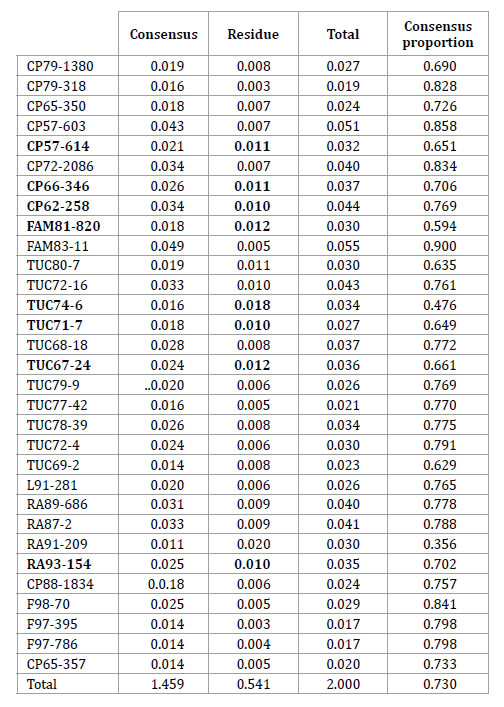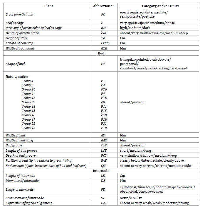 A total of 59 morphological variables from stem and leaf were evaluated. From these, 43 correspond with sugarcane UPOV (Union for the Protection of New Varieties of Plants) descriptors, while 16 are descriptors defined by Wagih (2004). Morphological traits comprised both qualitative (43) and quantitative (16) attributes. Most of these attributes (48) are not subjected to selection in breeding programs; 4 of them, related to stem traits, are subjected to screening as primary conditioning requisites, while other 7 are subsidiary traits related to leaves and canopy (table 2, page 44-45).