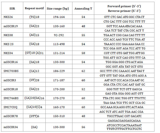 Table 3. Simple Sequence Repeat (SSR) primers used for genotyping 65 sugarcane accessions from the INTA Sugarcane Germplasm Bank (Tucumán, Argentina).
