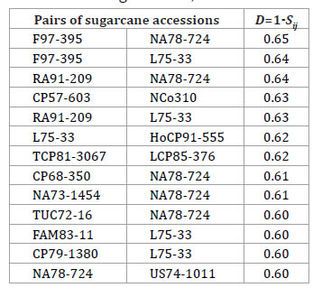 Table 4. Pairs of sugarcane accessions, with dissimilarities values higher than or equal to 0.60.