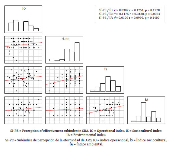 Figura 1. Correlación entre el subíndice de "percepción de la efectividad" y los índices operacional, sociocultural y ambiental.