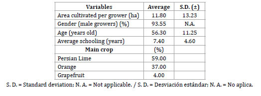The average number of hectares per grower interviewed was 11.8, mostly covered with Persian lime. The majority of growers were men (93.5%), 56.3 years old on average. The level of schooling of most of them was middle-school, 7% had received no schooling at all, and 10% had studied for more than ten years (table 1).