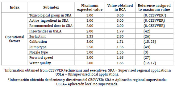 There are two types of operational factors that have an impact on the effectiveness of an application: i) the toxicant applied, and ii) the type of application (29). The values of the operational sub-indexes under assessment were close to the expected maximum in variables related to the toxicant applied, which includes the toxicological group (3 of 3), active ingredient (3 of 3) and applied dose (2 of 2). Therefore, high values could be explained given that these activities are supervised by CESVVER technicians; in addition, only the recommended insecticides are applied on the RCAs. However, those sub-indexes related to management of sprayers and insecticides, such as sprayer calibration (1.71 of 3), surfactant use (2.80 of 3.33), applicator advance speed (1.63 of 3), and water quality (1.65 of 2) had low values in relation to the effectiveness of the RCAs (table 2, page 111).