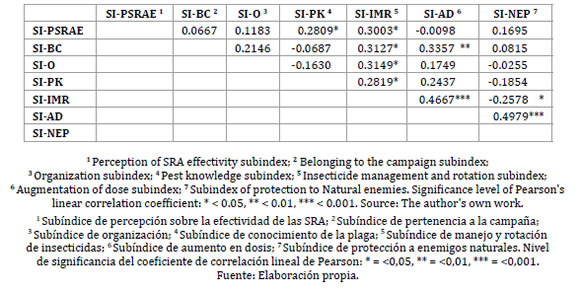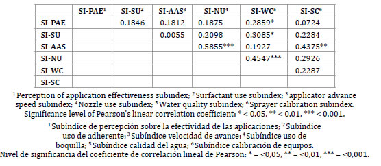 Correlation of the operational sub-indexes evaluated showed that those small farmers who have a higher perception of SRA effectiveness pay more attention to the quality of water they use in their applications (0.2859, p < 0.0043) (table 3, page 112).