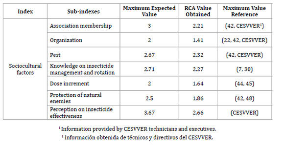 Sociocultural factors depend to a great extent on cognitive development, the social environment where each grower was raised, schooling and the level of training in pest management (1, 28). Growers' ideology, perception and knowledge vary among localities and therefore among the RCAs. In most cases, sociocultural sub-indexes obtained low values, particularly in aspects related to organization (1.41 of 2), knowledge about protection of natural enemies (1.86 of 2.5), management and rotation of insecticide (2.27 of 2.71), and growers' perception of SRA effectiveness (2.67 out of 3.67) (table 4, page 113).