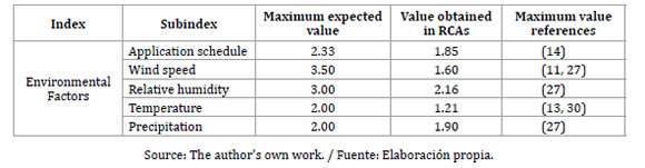 The value obtained from the environmental sub-indexes, was low in most cases. Some growers of the RCAs believe that certain environmental factors such as wind speed (1.60 of 3.5), relative humidity (2.16 of 3) and temperature (1.21 of 2) have no impact on SRA effectiveness. However, most of them suspend insecticide applications when probability of rainfall is not low (1.90 of 2) (table 6, page 115).