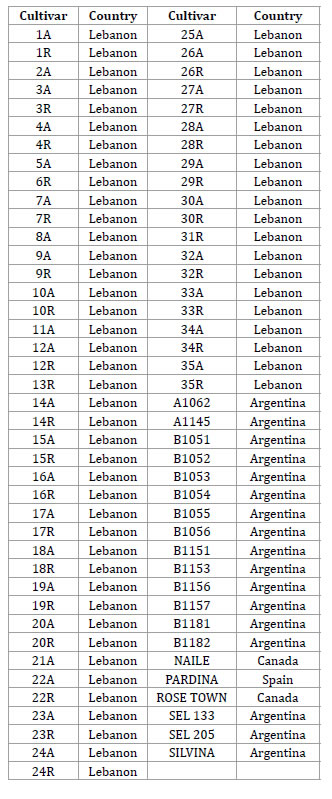 Table 1. Name and country of origin of the evaluated cultivars.
