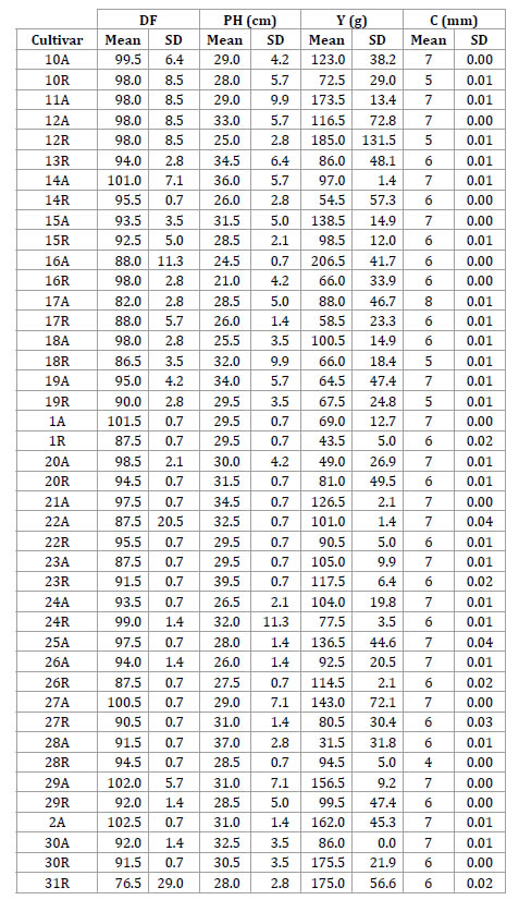 In PH, cultivar 4A was the tallest (44 cm) while B1053 was the shortest, with only 20.5 cm of plant height. Cultivars B1157 and B1051 had the best yielding with 363 g plot-1and 317 g plot-1 respectively, and cultivar SEL was the poorest with 15.5 g plot-1.