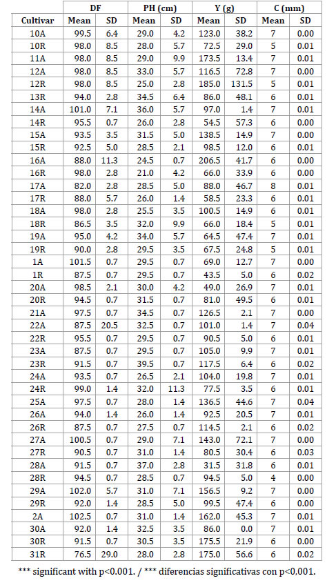 Regarding mean values, for DF, cultivars 7A, Rose Town and Pardina were late (104 and 105 DF) while cultivar 34A was the earliest (57 DF).