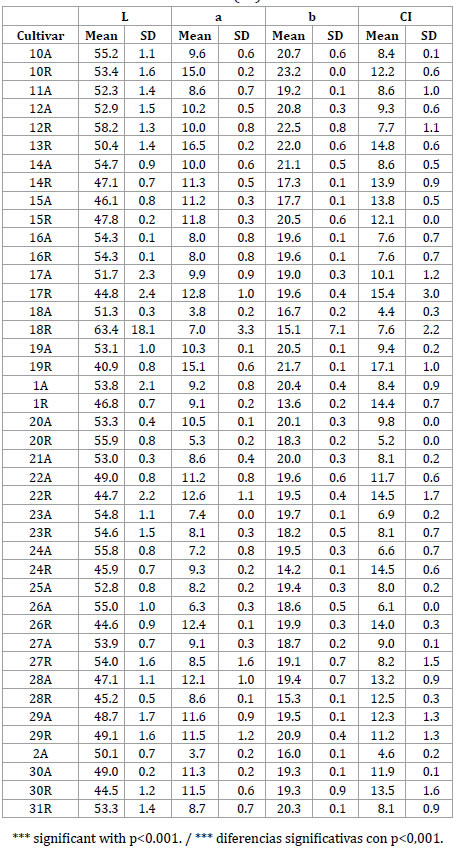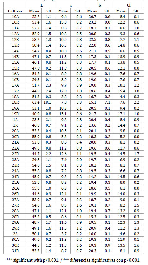 Tabla 3. Media, desviación estándar (SD), valor de LSD, valor de F y Heredabilidad en sentido amplio (H2B) para los caracteres L, las coordenadas de color a y b y el índice de color (CI).
