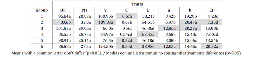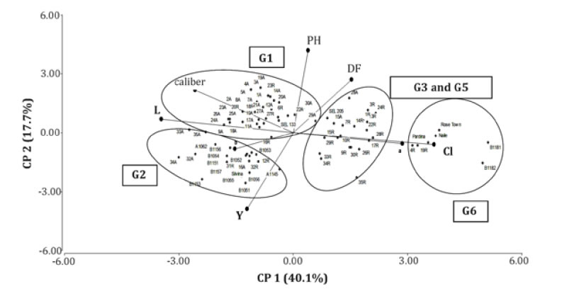 Group 3 had 17 cultivars with high values for coordinates a and b; group 4 included only one cultivar (18R) with the highest L; group 5 had 4 cultivars with lower C and coordinate b; and group 6, with 6 cultivars, had the cultivars with higher DF and CI but lower C and L.