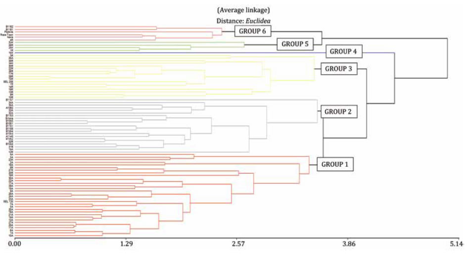 Cluster analysis (figure 1, page 10), showed that cultivars conformed six groups with differential traits.
