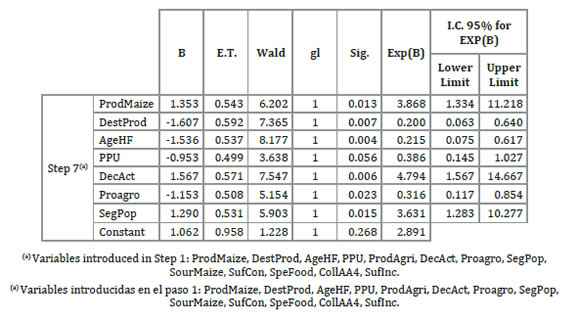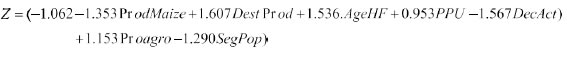Taking into account the variables related to production and the categories that express the highest frequency among the farmers interviewed, the variables can be characterized as follows: maize production is less than 2 t, and is intended only for family consumption; the PPU consists of only the plot; agricultural activity has decreased in recent years; the family does not receive support for production (Proagro Productivo), and has no healthcare service (Seguro Popular). Under these conditions the probability is as follows: