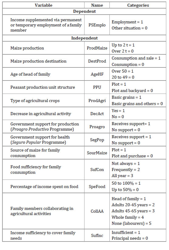 Considering the above, the dependent variable was defined as Peasant Strategies with Employment, which refers to whether or not income was supplemented by permanent or temporary employment of a family member. The categories defined were: Employment and Other situation. The first refers to whether or not a family member was temporarily or permanently employed outside the PPU. For farmers to be considered in the model estimation, they had to have performed agricultural activities, generating income or not. Only 123 out of 132 farmer responses were included because nine individuals had abandoned agricultural activities.