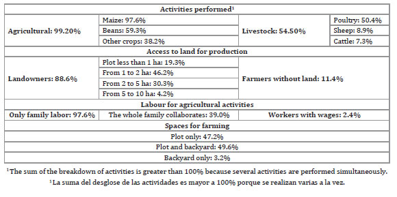 Activities are primarily performed in small, non-irrigated, family-owned plots, although it is common to rent or loan land, or to work in share- cropping, which are the means by which landless peasants produce. A decrease in agricultural activity was observed in 64.2% of the peasants studied; due to the decline in profitability of farming and the need to perform other activities to obtain income. For the rest (35.8%), there was no decrease in agricultural activity because farming is their main source of income; in addition to the fact that employment opportunities lack in their communities. The main reason for performing agricultural activities is to obtain food (44.7%).
