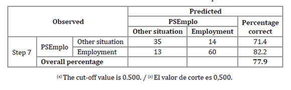 The method used in this study reached results after 7 steps. The summary (the Cox and Snell R2) indicated that 34.1% of the variation of the dependent variable is explained by the independent variables included in the model. Goodness of fit, determined through the Hosmer- Lemeshow test, indicates a good fit of the model in the seventh step (p= 0.948), given the high value of the predicted probability. Therefore, the hypothesis stating that the coefficients are equal to zero is rejected. The model was able to accurately classify 82.2% of those employed outside the PPU as well as 77.9% who are either employed or in another situation (table 4).