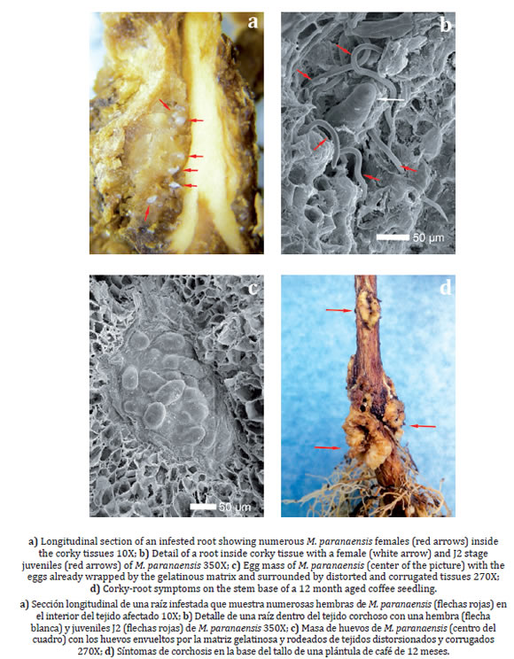 Many females, eggs and second juvenile stage (J2) of M. paranaensis were observed in the roots affected with the coffee corkyroot disease (figure 1a, 1b and 1c, page 284).