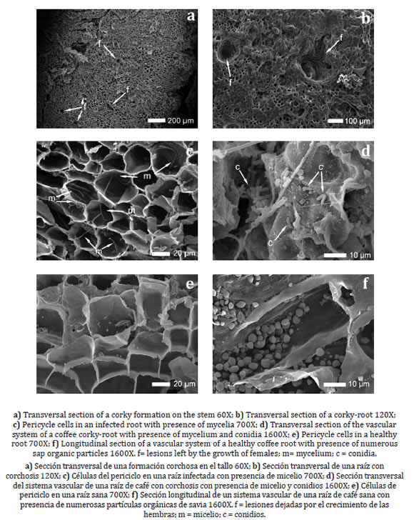 Figure 2. Sections of healthy and infested coffee roots and stems observed under scanning electron microscope.