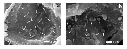 Many organic particles which nature was confirmed by energy-dispersive X-ray spectroscopy (72.1% C and 27.9% O) (figure 2e, f, page 285), were observed in the vascular system of healthy roots. This material was not observed in the vascular systems of diseased roots, revealing a dysfunction in the vascular nutrient transport. Numerous bacteria were observed in the corky root tissues (figure 3a, b) while no bacteria were observed in healthy tissues.