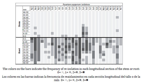 The strain So1 presented the highest (F = 3.0639, P = 0.00) frequency of re-isolations in the stem (33%) to 30 mm hight, although the NE 5 strain was isolated at 40 mm from the stem base. In the plants with injured roots 25 of the 27 strains of F. oxysporum were re-isolated from the roots, 270 (93.75%) re-isolations corresponded to the root and 18 (6.25%) to stems.
