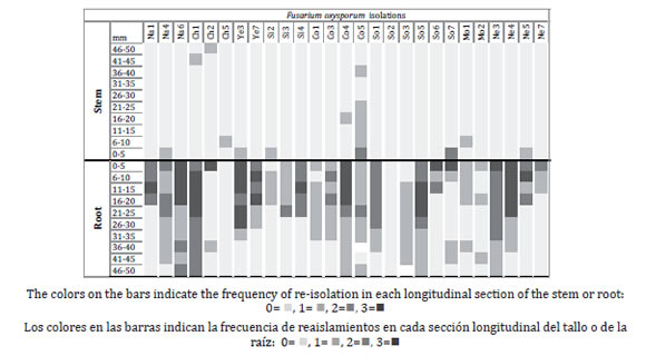 The Ch1 and Na6 strains presented the highest (F=3.8618, P= 0.000) percentage of re-isolations in root, with 80 and 67%, respectively. Eleven strains of F. oxysporum were re-isolated from the stems of this group of plants with injured root. The Co5 strain presented the highest percentage of the re isolation (23%) to the height of 40 cm (F = 3.2517, P = 0.00). However, the maximum height was recorded for the strains Ch1 and Ch2 which were found at 45 and 50 mm from the stem base, respectively.